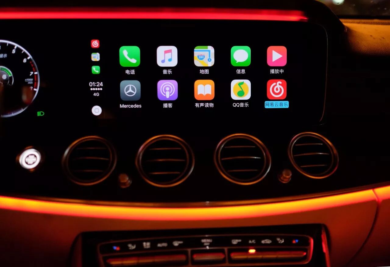 再看賓士 E級車的CarPlay,雖然需要有線連接,但連接十分順暢穩定,並且在使用中還可以順便把手機的電給充了。在連接Carplay之後,可以直接使用手機上的導航軟件,還真是方便不少,對於習慣用手機地圖導航的車主來說,確是一大福音了。